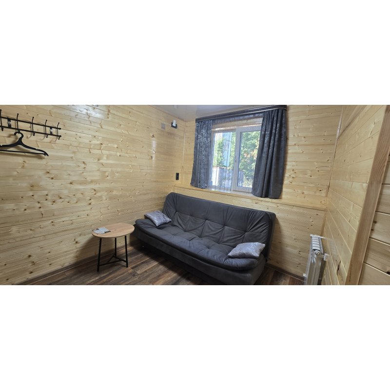 Кухня-гостиная оборудована новой мебелью (кухня,стол,стулья,диван), новой бытовой техникой(микроволновая печь, эл.чайник,индукционная плита, холодильник, конвекторный обогреватель, бойлер),в наличии вся необходимая посуда.